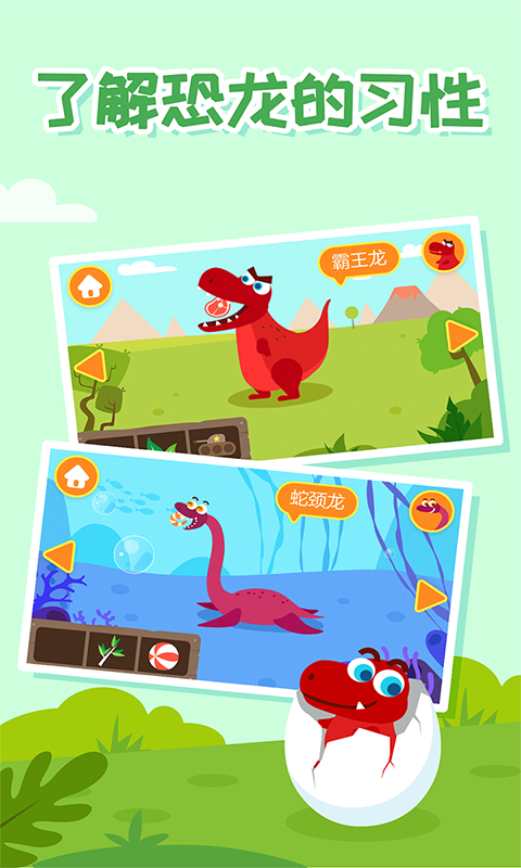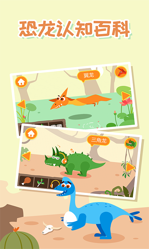 3. 点击恐龙角色可播放叫声、观看简短动画,并听到趣味小知识语音;