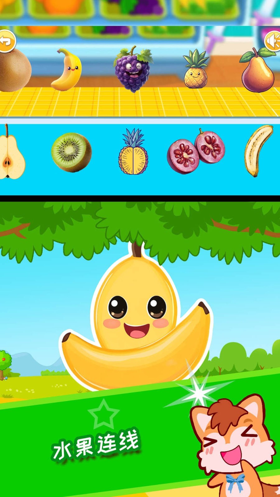 2. 点击任一水果图标,进入互动页面:可点击听名称发音、拖动匹配影子、完成简单拼图