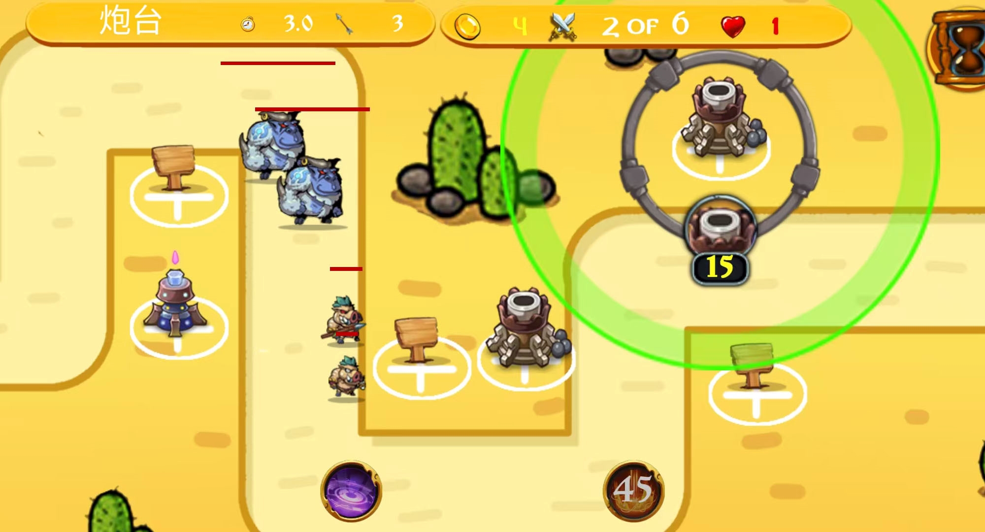 2. 点击底部塔栏选择防御塔,在指定格子中拖拽放置