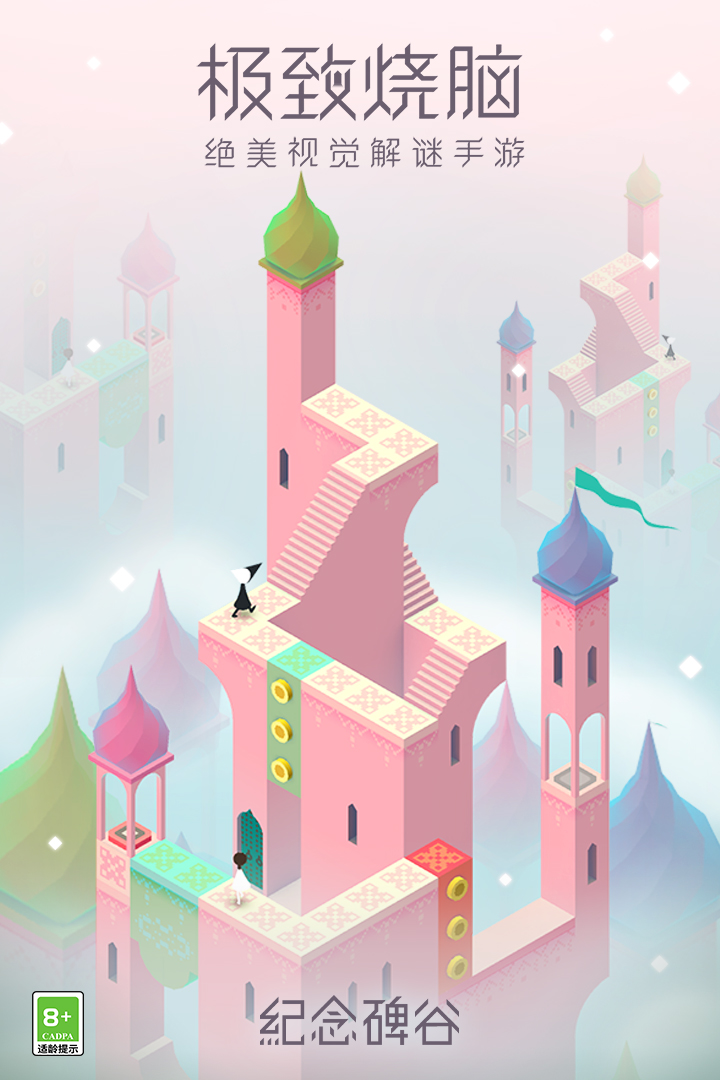 《纪念碑谷》(Monument Valley)是一款由Ustwo Games开发的解谜类手机游戏,首次发布于2014年。游戏以极简主义美术风格、错视几何结构与埃舍尔式空间悖论为核心特色,玩家通过旋转、滑动和交互建筑结构,引导角色艾达穿越充满视觉幻象的神秘纪念碑,完成一段静谧而富有哲思的旅程。游戏融合了艺术、建筑与叙事,被广泛誉为移动平台上的交互艺术典范。